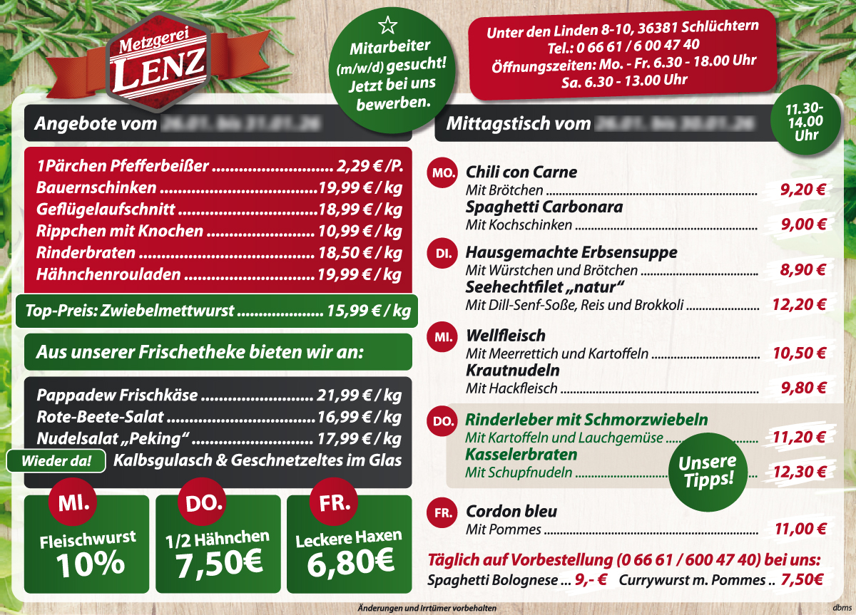 Mittagstisch vom 16.02. – 20.02.2026Die Metzgerei Lenz wünscht Ihnen einen guten Appetit!ZucchinisuppeWildschweingulaschRosenmontag bis 13 Uhr geöffnet !LendentopfKrautkopfBologneseschnitzelSchupfnudelauflauf1/2 HähnchenKnusprige HaxeWellfleischHausgemachter Matjessalat8,90 €12,50 €12,20 €10,90 €11,00 €10,50 €9,70 €7,50 €6,80 €10,70 €Mit Würstchen und BrötchenMetzgerei Lenz 2026 | Rechtschreibfehler und Irrtümer vorbehalten.Mit Knödeln und RotkohlMit Spargel, Sauce Hollandaise